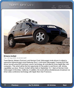 This special “Drivers invited” event, to be held on Sep 10 at Herman Cook Volkswagen in So California, will involve a multi-camera iChat video conference with the Apple Store in San Francisco to let Bay Area fans get a chance to see inside Dora and ask questions of the Team Banzai scientists.